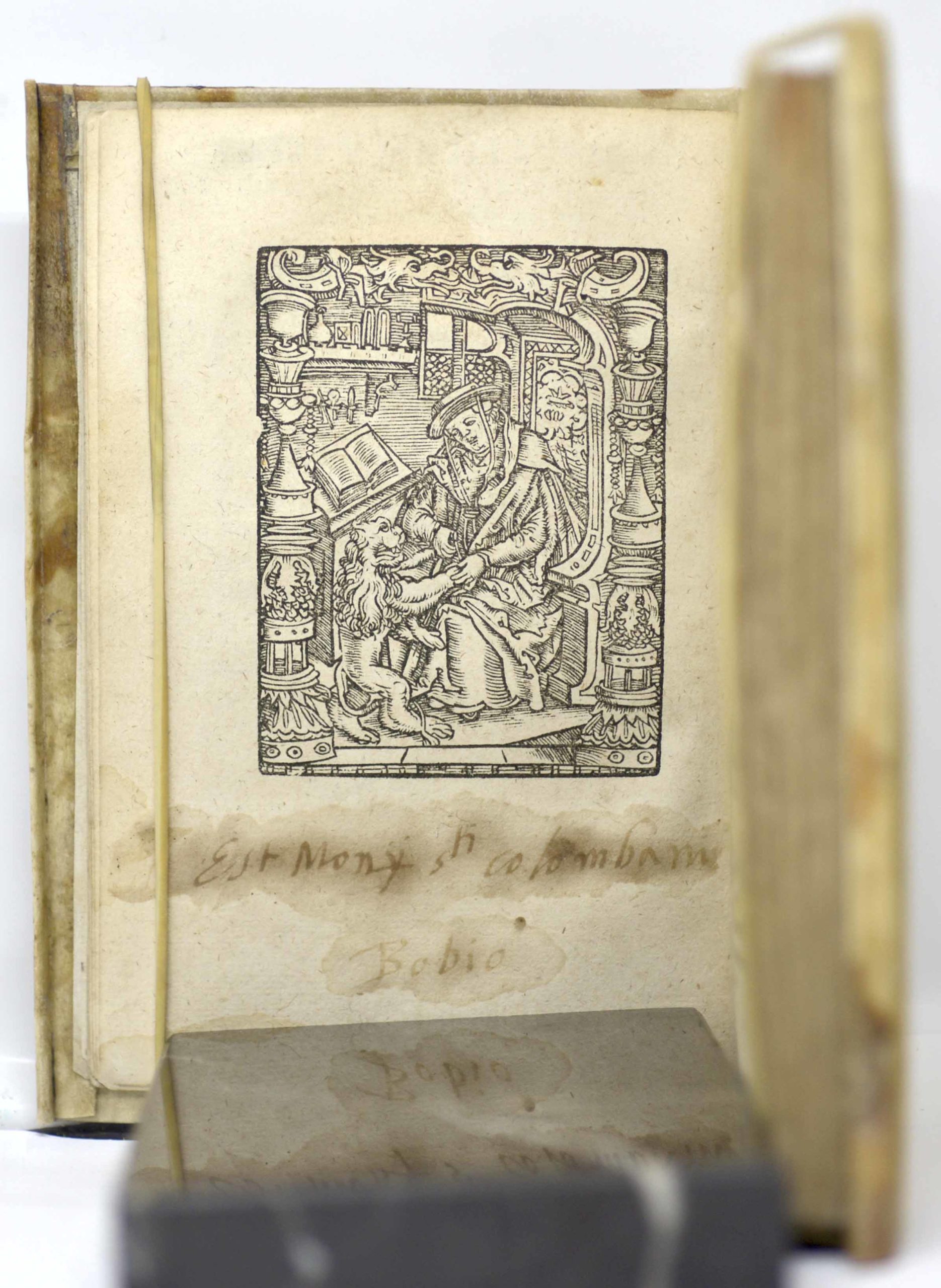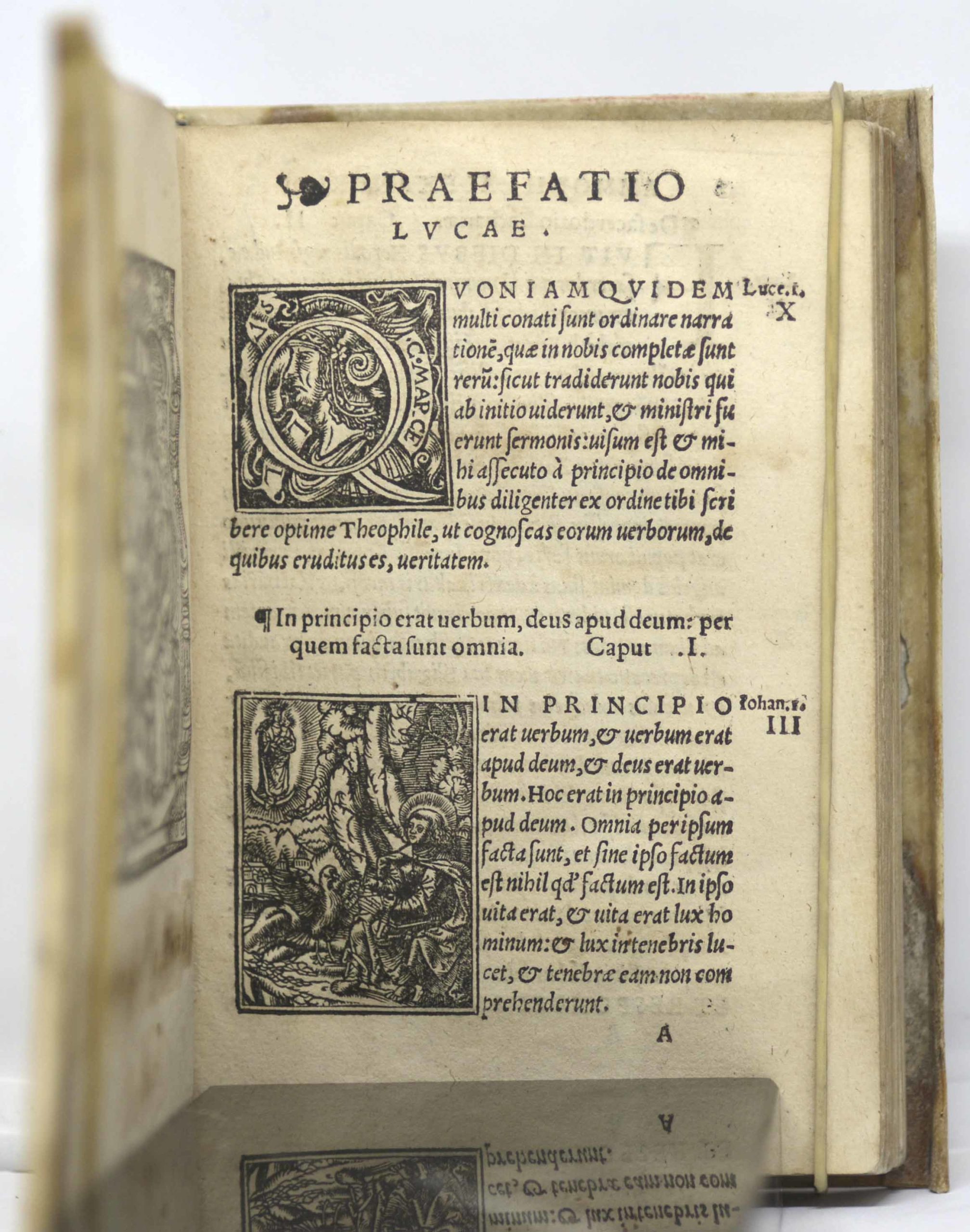 Ouvrage avec textes, concordance et table s’ouvrant sur une belle page de titre gravée (frise d’encadrement à la romaine représentant divers personnages, dont Dionysos, Cléopâtre), suivie d’une gravure de saint-Jérôme et le lion d’après Albrecht Dürer, ainsi que de deux lettrines (dont l’une représentant saint Jean écrivant sous la dictée de l’aigle).