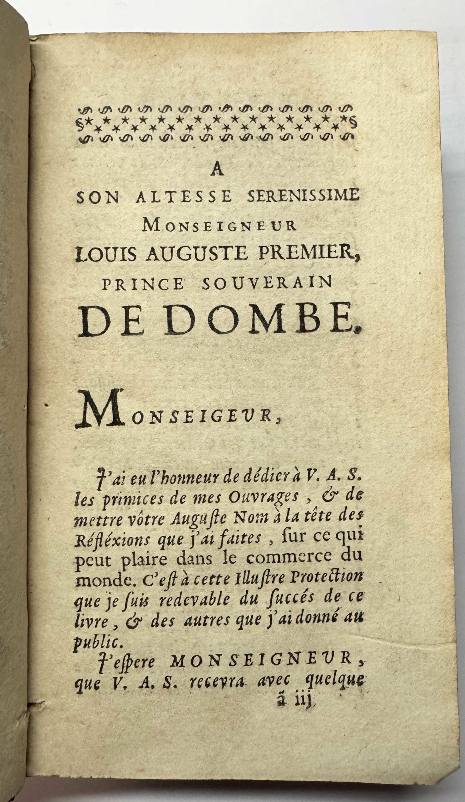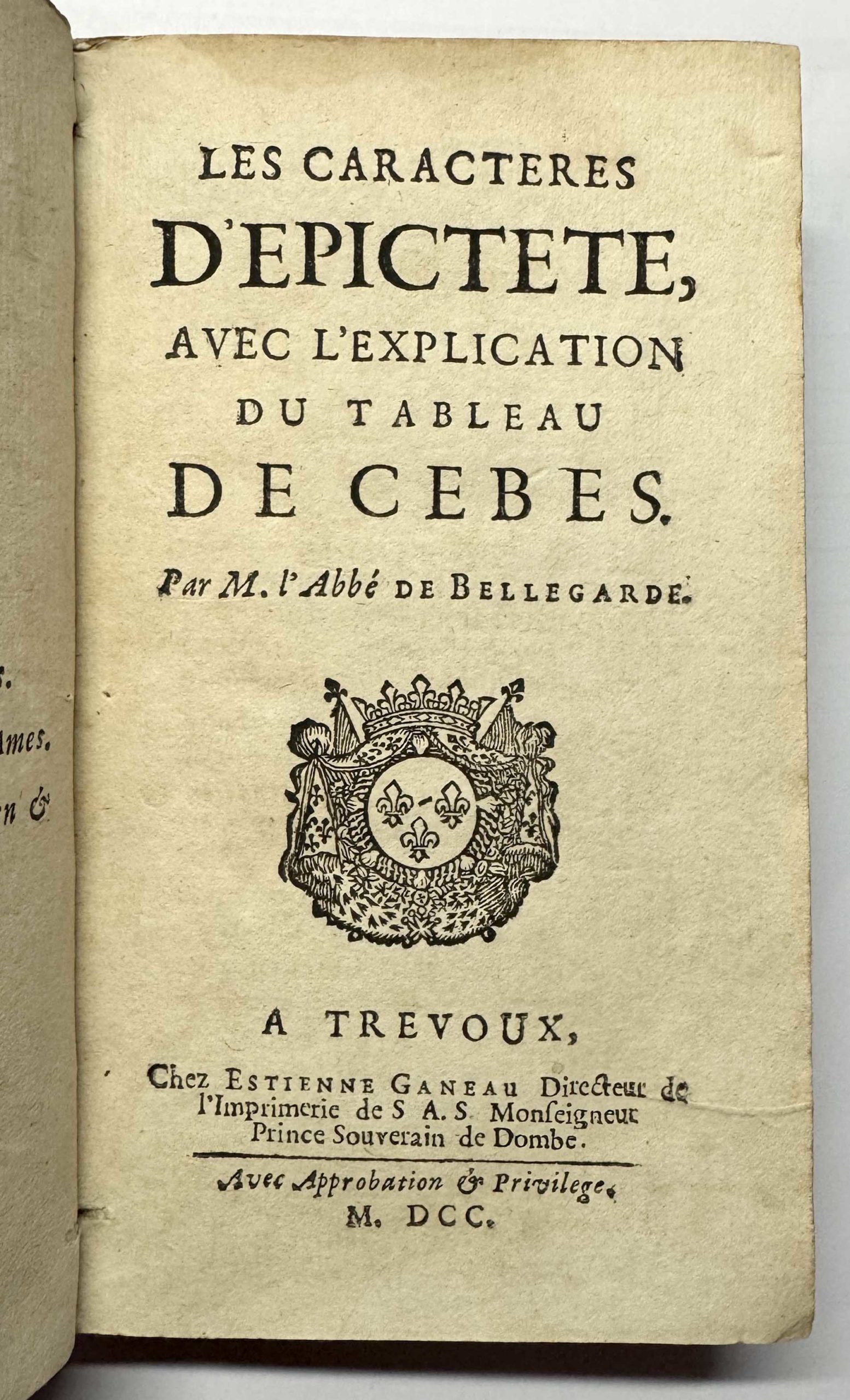 Première édition de la traduction des Caractères d’Epictète par l’abbé Morvan de Bellegarde (1648-1734), jésuite, écrivain et historien dont les oeuvres étaient particulièrement prisées à la fin du XVIIe siècle et au début du siècle suivant. A noter la préface de Son Altesse Sérénissime le prince de Dombes, dont l’imprimeur attitré à Trévoux, dans l’actuel département de l’Ain, sera précisément Estienne Ganeau (1667-1734).