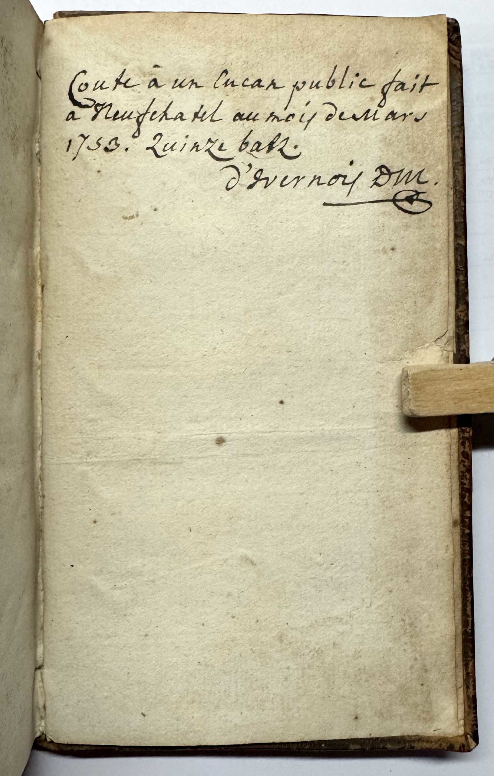 Traces d’usage sur les plats, le dos et les coins, coiffe supérieure arrasée et mors fendu, papier légèrement jauni, quelques très rares rousseurs, inscription ancienne à la plume sur la dernière garde (M. d’Ivernois à Neuchâtel, 1753).