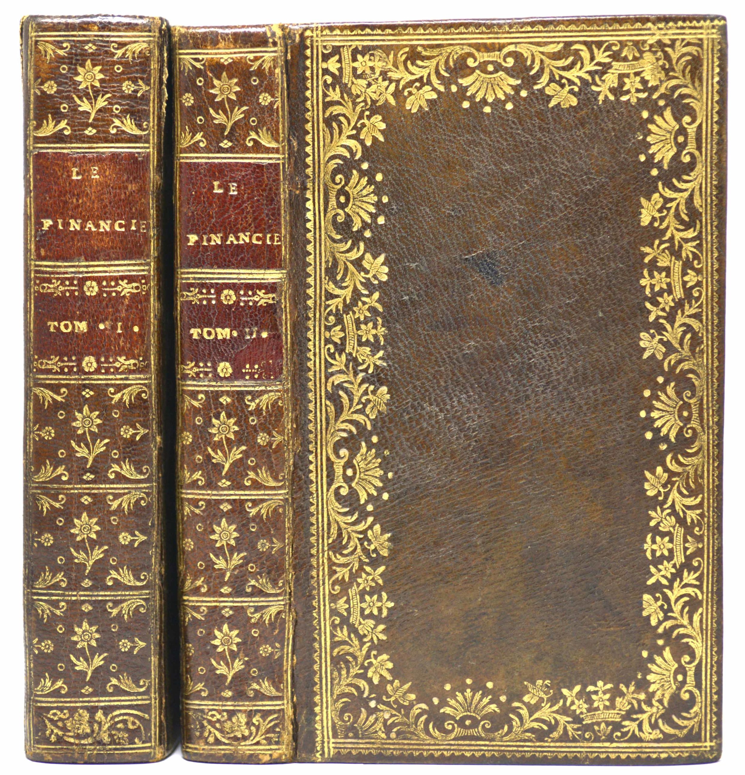Très belle reliure d’époque en plein maroquin marron, plats encadrés d’une magnifique dentelle florale au fer, dos lisse orné de caisssons fleuronnés, pièce de titre bordeaux, titre et tomaison en lettres dorées, filet simple sur les coupes, roulette sur les chasses, toutes tranches dorées.