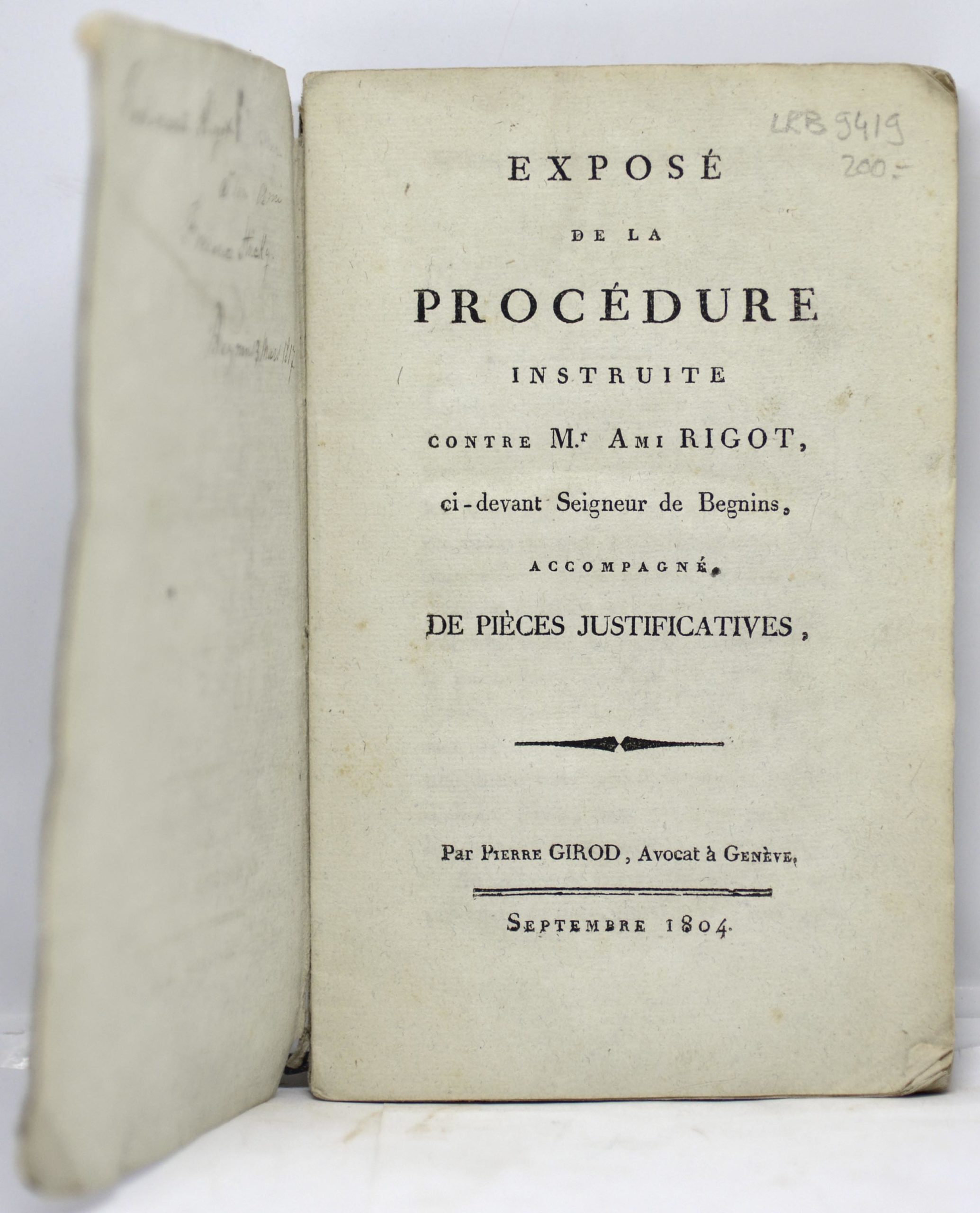 ![GIROD / [RIGOT, Ami], Exposé de la procédure instruite contre Mr Ami Rigot, ci-devant Seigneur de Begnins, accompagné de pièces justificatives, 1804 – Image 3](https://librairieunivers.ch/wp-content/uploads/2025/12/9419-scaled.jpg)