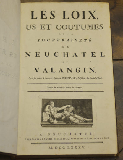 Les Loyx, us et coutumes de la Souveraineté de Neuchâtel et Valangin. Par feu noble & vertueux Samuel Osterwald, président du Conseil d’Etat.