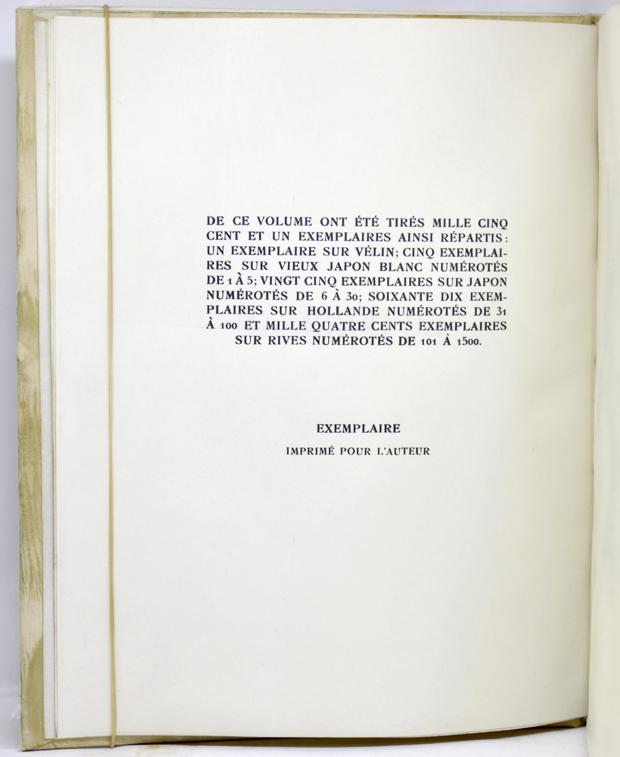 Tirage limité à mille cinq cent et un exemplaires, celui ci est le seul exemplaire unique du tirage de tête sur velin, imprimé pour l’auteur, avec en frontispice l’eau-forte originale signée à la main par Mariette Lydis et le dessin préparatoire originale sur Japon impérial signé et annoté par l’artiste.