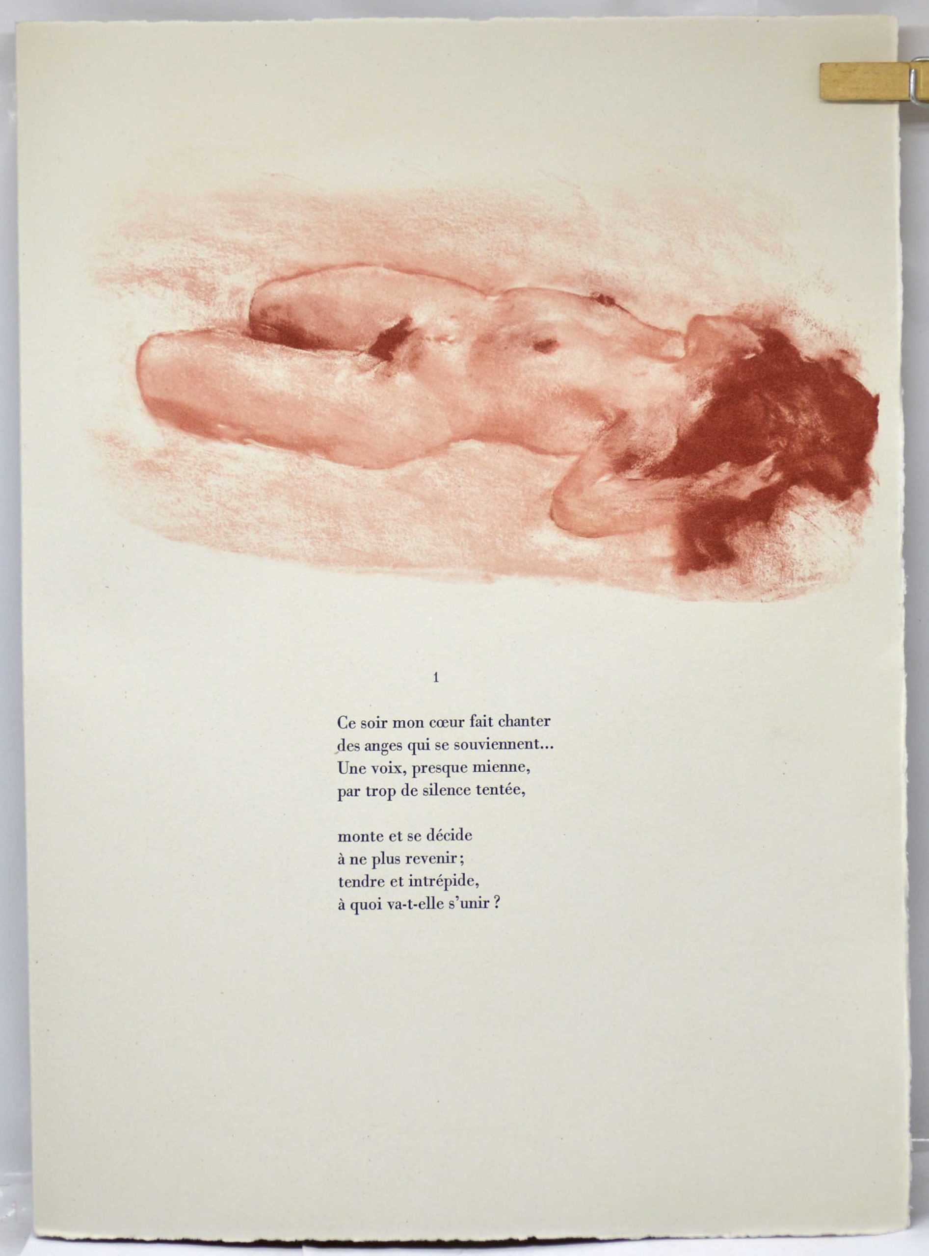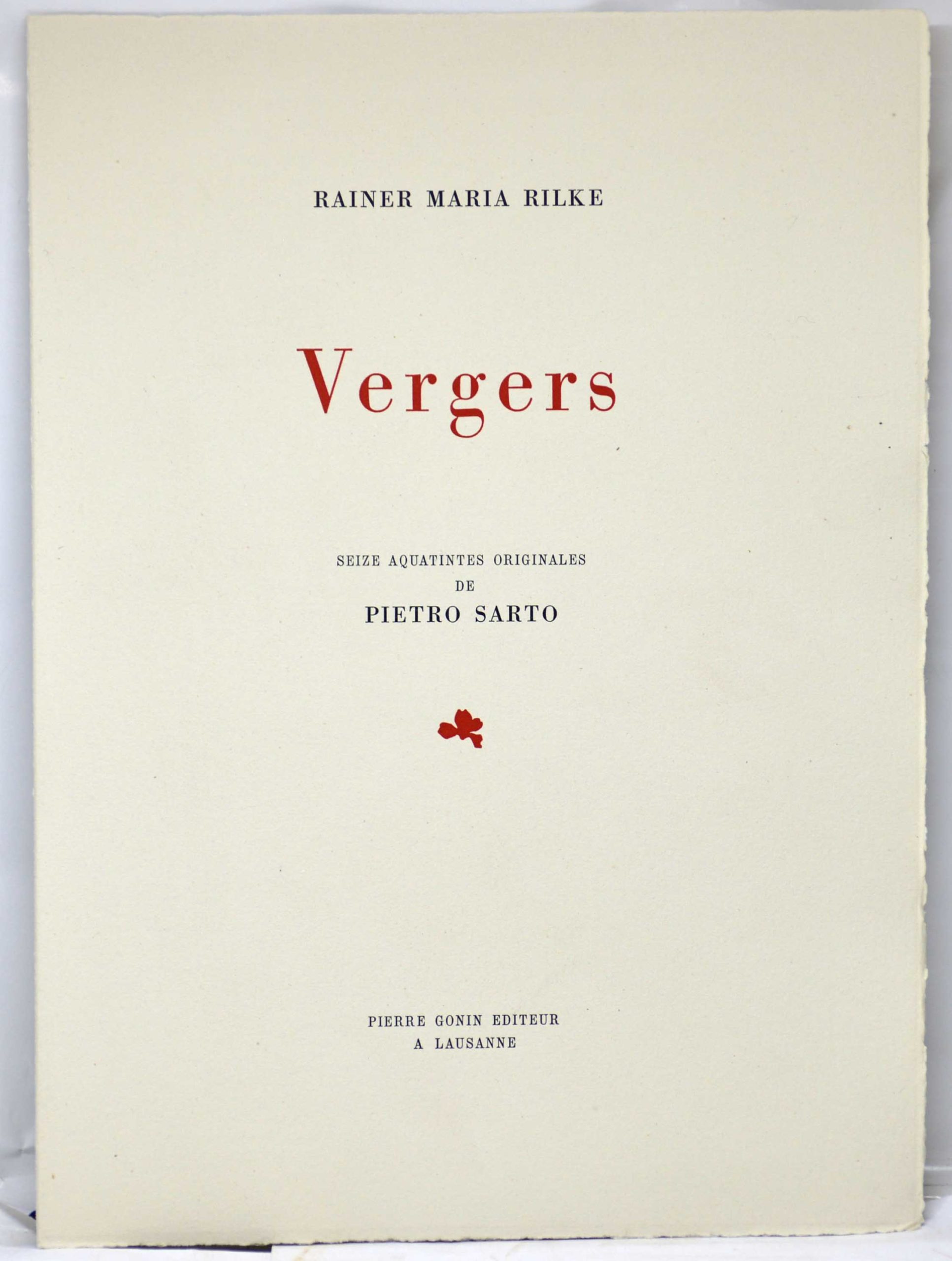 Poèmes de Rilke ornés de 16 aquatintes originales de Pietro Sarto, 9 hors-texte en couleurs et 7 in-texte libres en sanguine. Les gravures sont comprises dans la pagination.